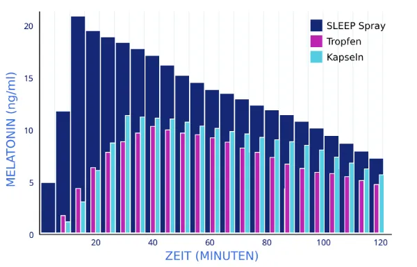 Diese Studie zeigt, dass das Melatonin von SLEEP bereits nach nur 5 Minuten im Blut der Probandinnen nachweisbar und zudem doppelt so hoch konzentriert ist. Im Gegensatz zu herkömmlichen Melatonin-Produkten, die auch nach knapp 30 Minuten nur etwa halb so gut aufgenommen wurden.